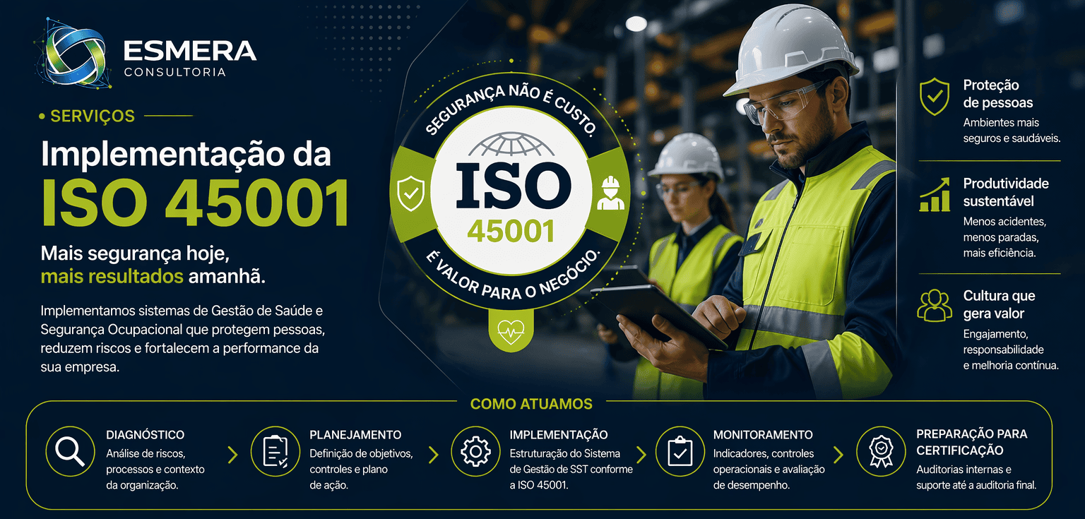 Segurança não é custo. É o que sustenta a operação e evita perdas invisíveis que travam o crescimento. A ISO 45001, quando bem implementada, deixa de ser obrigação legal e passa a ser um sistema que protege pessoas, reduz riscos e melhora performance operacional. Na Esmera, estruturamos isso para funcionar na prática.
